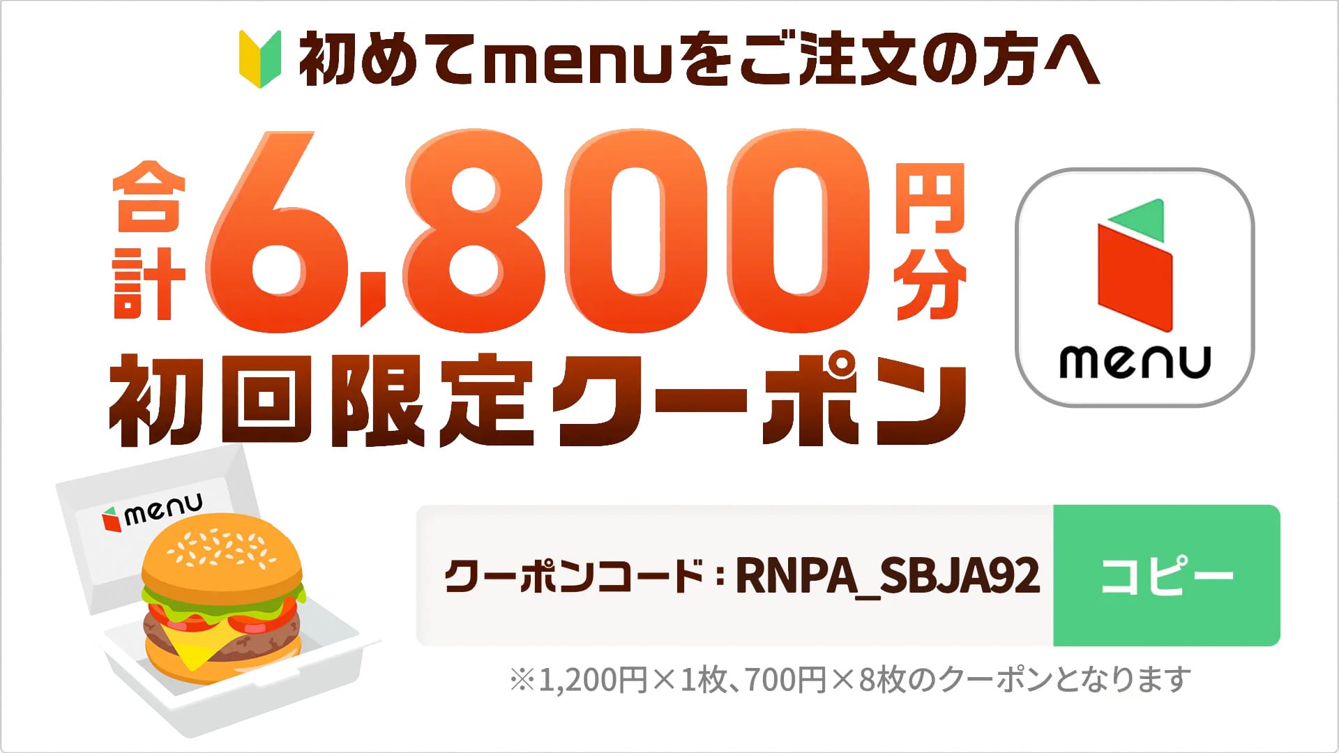 menuアプリインストール後、クーポンコード「RNPA_SBJA92」を入力してご利用ください。